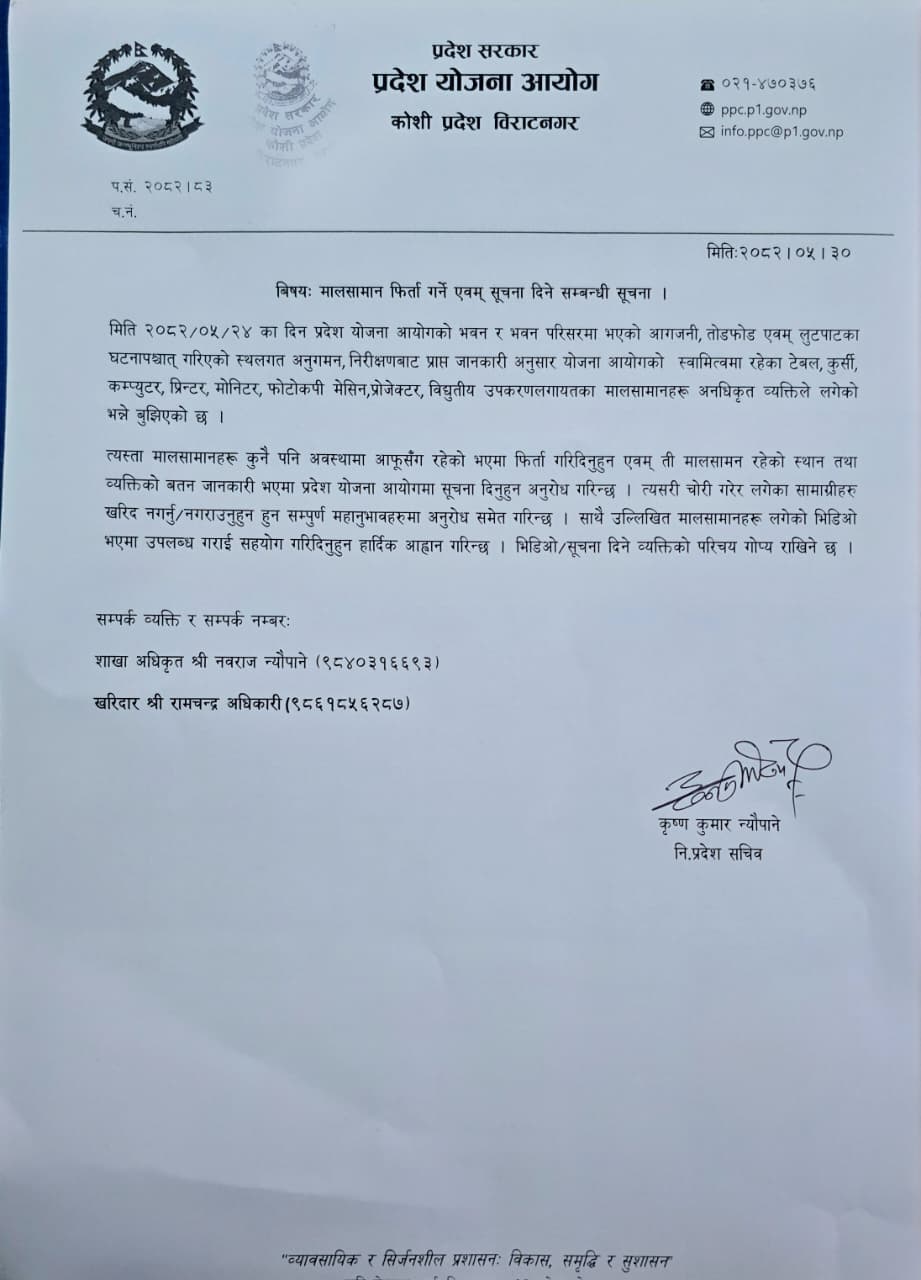 सामान फिर्ता गर्ने एवं सूचना दिने सम्बन्धी सूचना